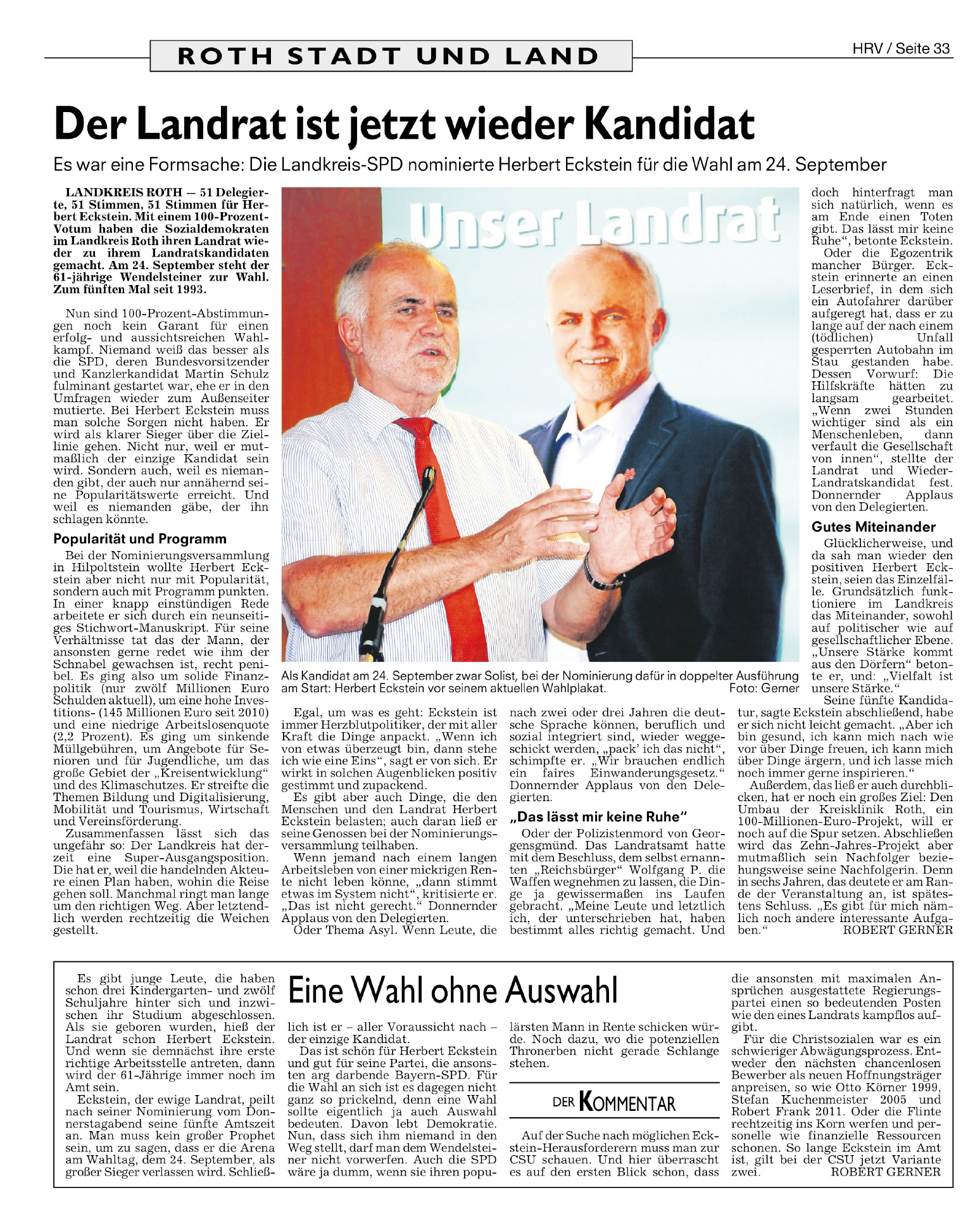 Alexander Horlamus, der Direktkandidat der SPD für den Wahlkreis Roth/Nürnberger Land, wird gefragt, was man sich von Herbert Eckstein abschauen könne. „Nicht nur in den Hinterzimmern Politik zu machen, sondern unter die Leute zu gehen“, sagt der Laufer Rechtsanwalt. Man schaue aus dem Nürnberger Land schon etwas neidisch nach Roth, zumal man auch sehe, wie wichtig es sei, einen SPD-Landrat zu haben.