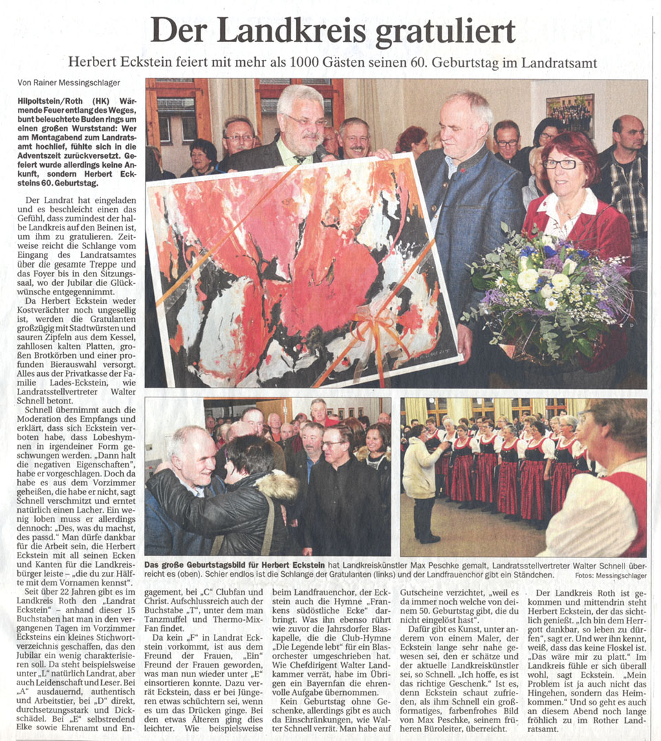 Dafür gibt es Kunst, unter anderem von einem Maler, der Eckstein lange sehr nahe gewesen sei, den er schätze und der aktuelle Landkreiskünstler sei, so Schnell. "Ich hoffe, es ist das richtige Geschenk." Ist es, denn Eckstein schaut zufrieden, als ihm Schnell ein großformatiges, farbenfrohes Bild von Max Peschke, seinem früheren Büroleiter, überreicht.