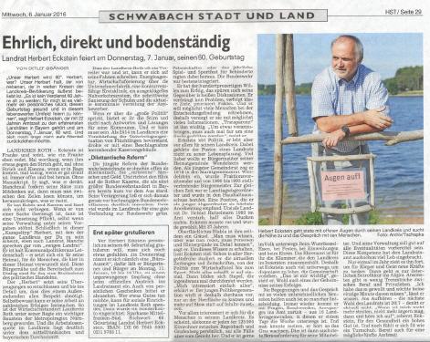 „Es ist kein Verdienst, 60 Jahre alt zu werden; für mich ist es vielmehr ein persönliches Glück, diesen Geburtstag gesund und in diesem lebenswerten Umfeld feiern zu können“, sagt Herbert Eckstein, der mit 22 Jahren Amtszeit zu den erfahrensten Landräten in Bayern gehört und am Donnerstag, 7. Januar, 60 wird. Und sich noch lange nicht aufs Altenteil zurückziehen möchte.