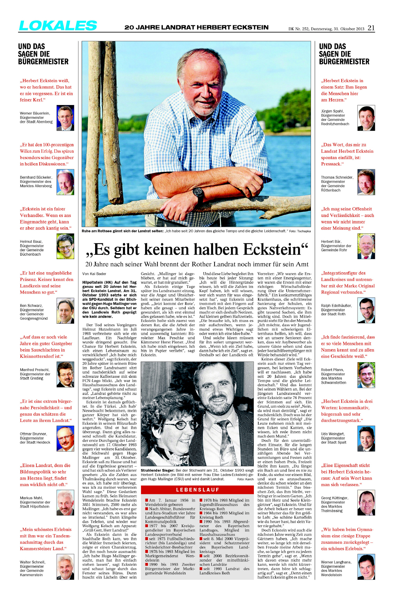 Der direkte Kontakt zu den Landkreisbürgern, wobei er anscheinend die Biografie fast eines jeden kennt, ist sicher etwas, was Eckstein von vielen anderen unterscheidet. Sein erster Wahlkampfslogan 1993 sei „Miteinander reden“ gewesen, sagt Ehrhardt. Er habe damals Bürgersprechstunden angekündigt, das sei aber anders als geplant gekommen. „Er hat eigentlich immer Sprechstunde.“ Die Bürger seien seine besten Berater, aber er habe nie jemand nach dem Mund geredet und auch nie versucht, es allen recht zu machen.