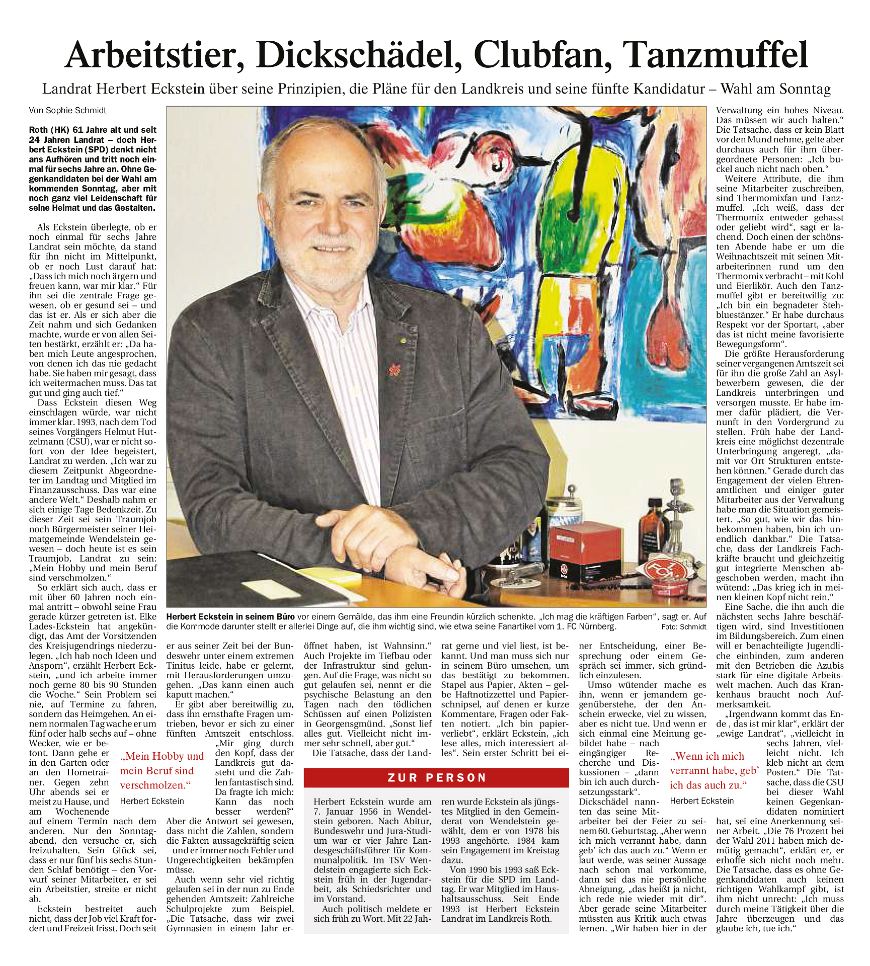 Seit über 22 Jahren gibt es im Landkreis Roth den "Landrat Eckstein" - anhand dieser 15 Buchstaben hat man in den vergangenen Tagen im Vorzimmer Ecksteins ein kleines Stichwortverzeichnis geschaffen, das den Jubilar ein wenig charakterisieren soll. Da steht beispielsweise unter "L" natürlich Landrat, aber auch Leidenschaft und Leser. Bei "A" ausdauernd, authentisch und Arbeitstier, bei "D" direkt, durchsetzungsstark und Dickschädel. Bei "E" selbstredend Elke sowie Ehrenamt und Engagement, bei "C" Clubfan und Christ. Aufschlussreich auch der Buchstabe "T", unter dem man Tanzmuffel und Thermo-Mix-Fan findet.
