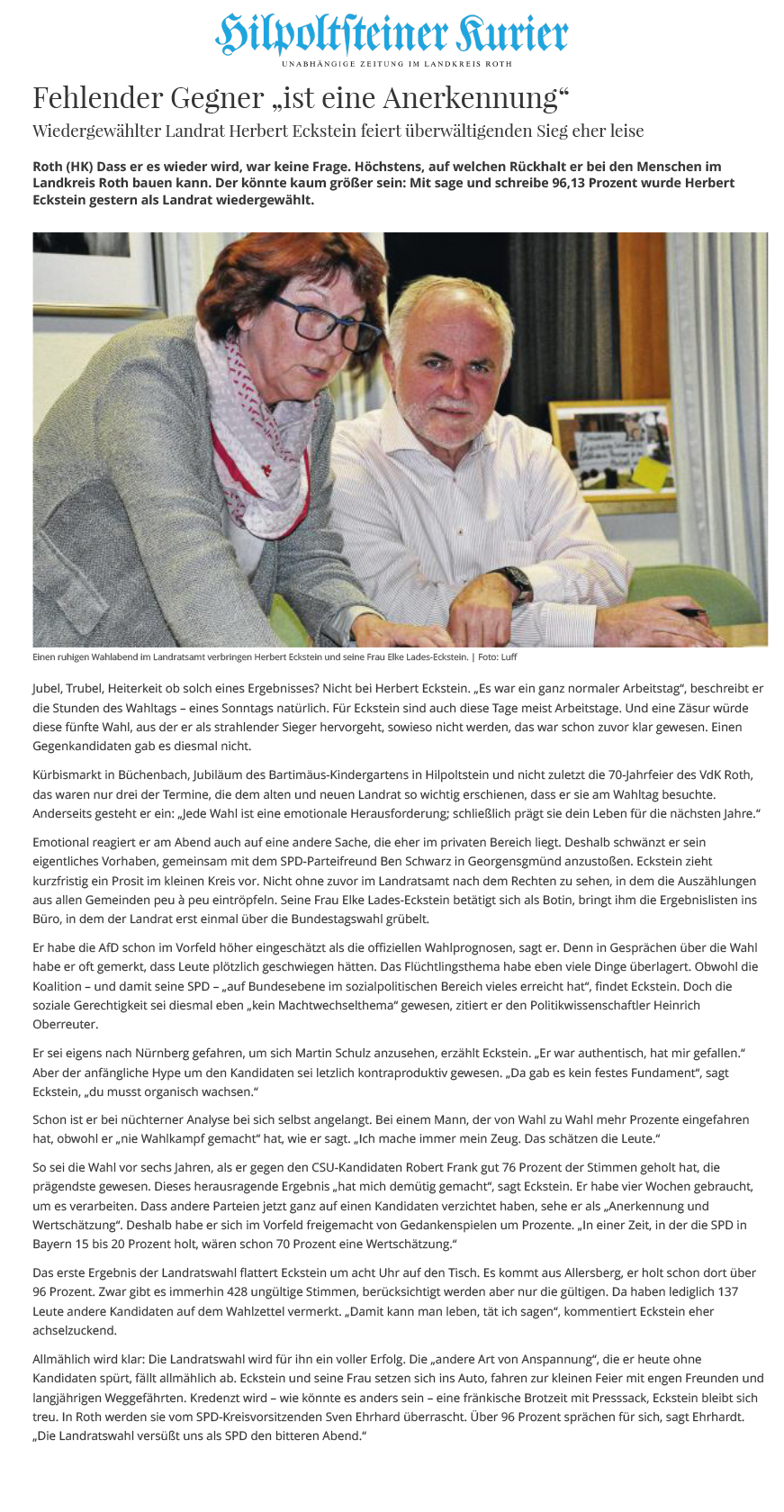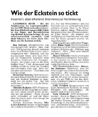 Der direkte Kontakt zu den Landkreisbürgern, wobei er anscheinend die Biografie fast eines jeden kennt, ist sicher etwas, was Eckstein von vielen anderen unterscheidet. Sein erster Wahlkampfslogan 1993 sei „Miteinander reden“ gewesen, sagt Ehrhardt. Er habe damals Bürgersprechstunden angekündigt, das sei aber anders als geplant gekommen. „Er hat eigentlich immer Sprechstunde.“ Die Bürger seien seine besten Berater, aber er habe nie jemand nach dem Mund geredet und auch nie versucht, es allen recht zu machen.
