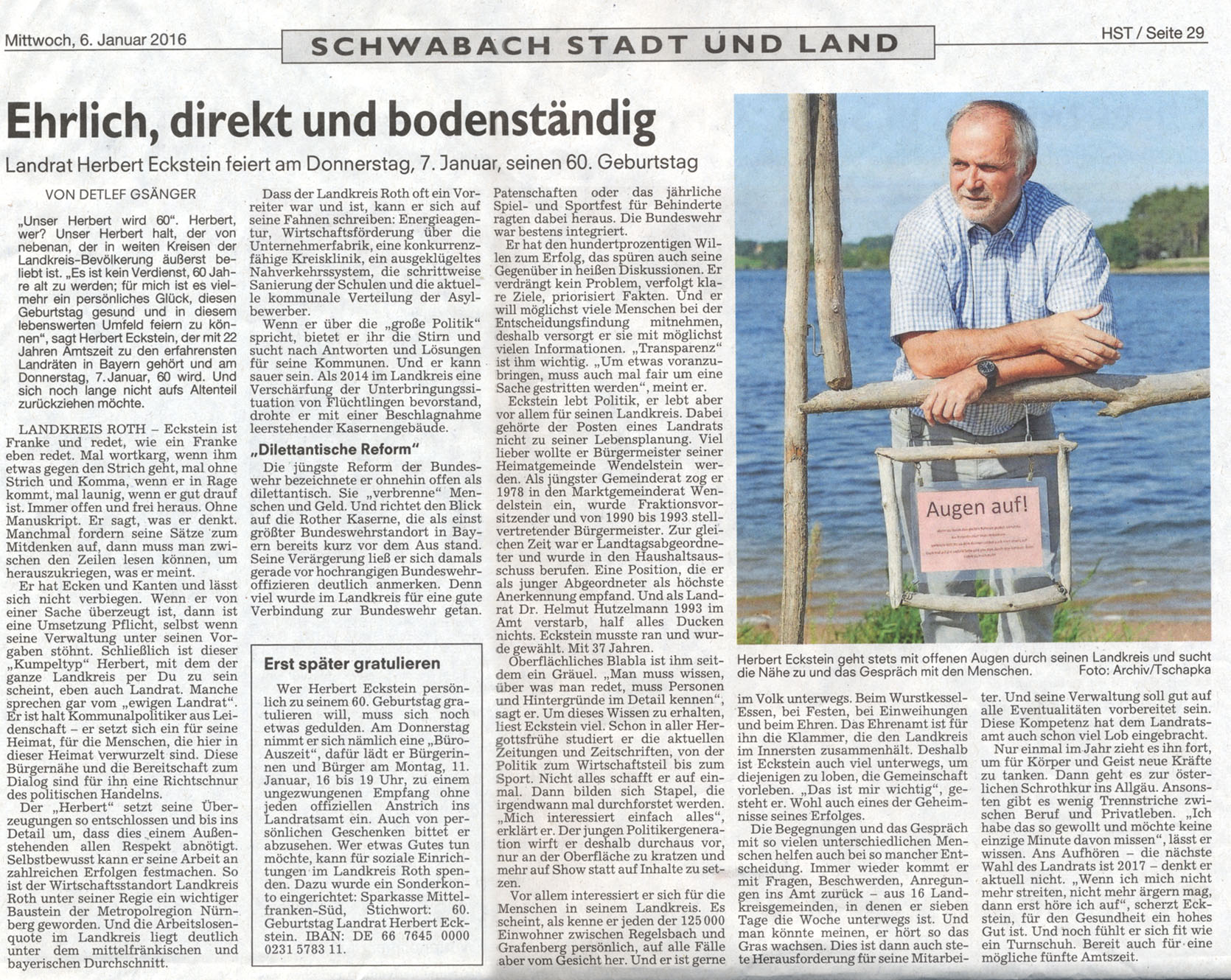„Es ist kein Verdienst, 60 Jahre alt zu werden; für mich ist es vielmehr ein persönliches Glück, diesen Geburtstag gesund und in diesem lebenswerten Umfeld feiern zu können“, sagt Herbert Eckstein, der mit 22 Jahren Amtszeit zu den erfahrensten Landräten in Bayern gehört und am Donnerstag, 7. Januar, 60 wird. Und sich noch lange nicht aufs Altenteil zurückziehen möchte.